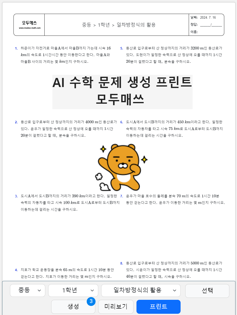 모두매쓰는 같은 유형의 수학 문제를 무제한으로 생성할 수 있는 인공지능 서비스입니다.