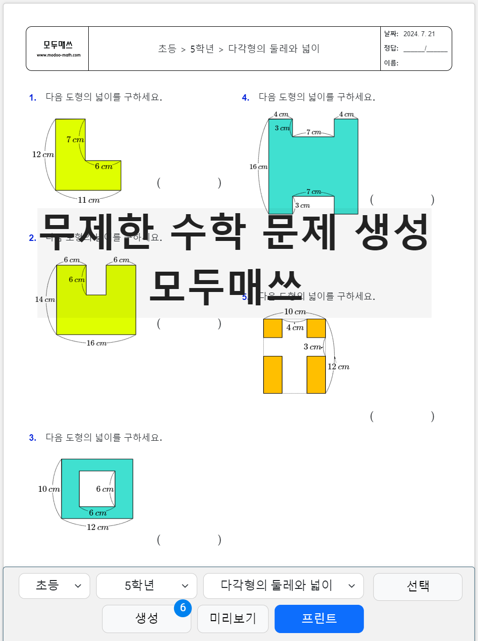 모두매쓰는 초중고 수학 문제를 유형별로 무제한 생성하여 프린트할 수 있는 학습 사이트입니다.