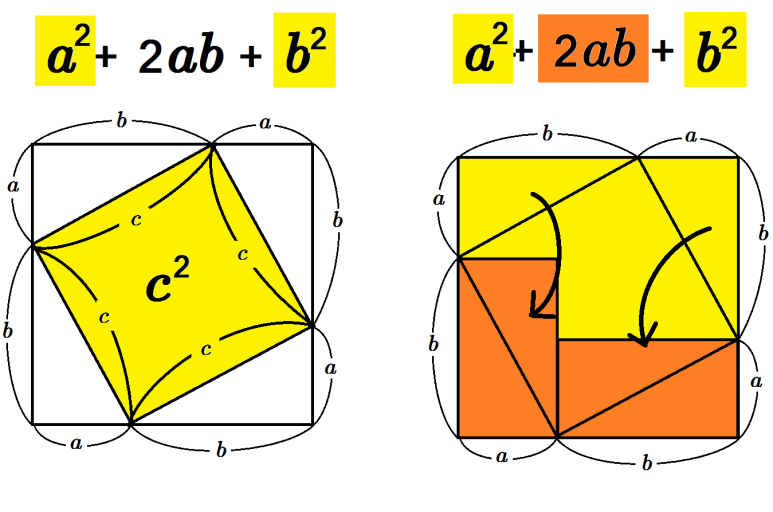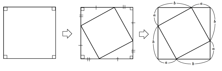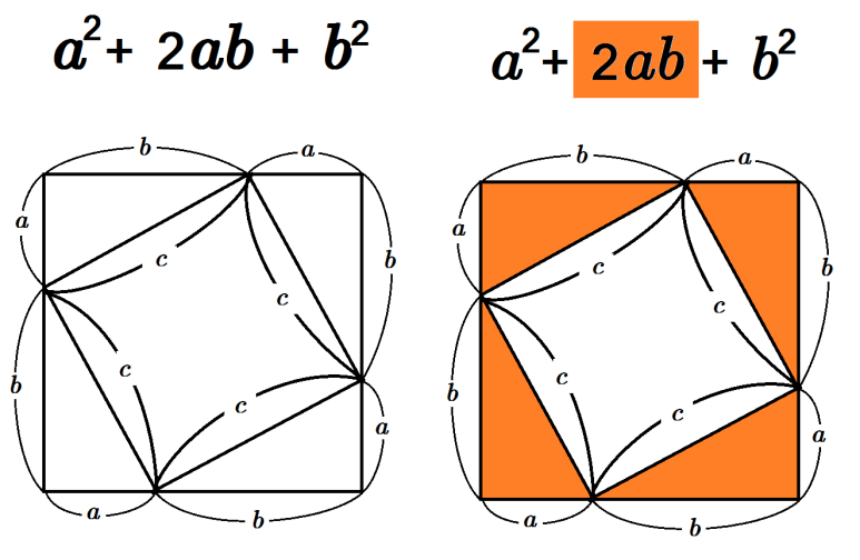a제곱과 b제곱의 합인데 그림을 보면 자연스럽게 c제곱과 같다는 것을 알 수 있지요.