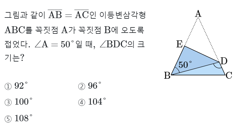 따라서 각BDC=180˚-15˚-65˚=100˚