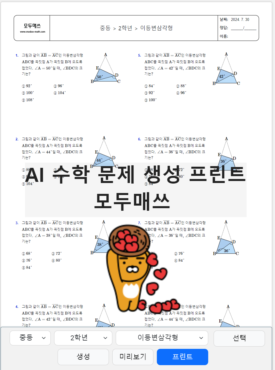 중등 2학년 수학 > 이등변삼각형 > 꼭짓점을 접어서 다른 꼭짓점에 이은 연습문제 프린트 학습지