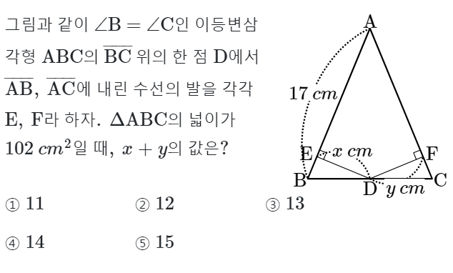 중등 2학년 수학 > 이등변삼각형 > 밑변의 한 점에서 각 변에 내린 수선의 발의 길이를 x, y라 할 때, x+y의 값 구하기 연습문제 프린트 학습지