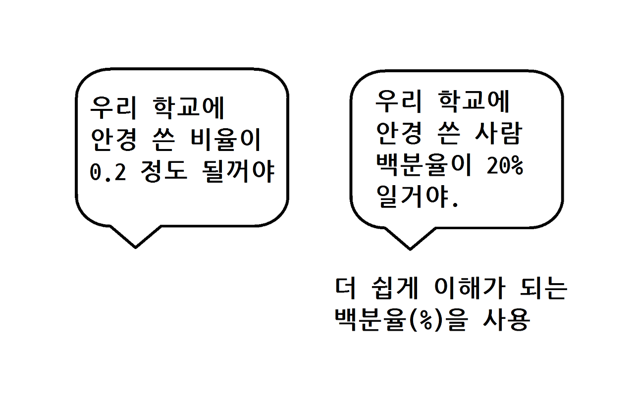 그런데 전체의 값을 100으로 하는 것을 특별히 '백분율'이라고 명칭하고, 사용하기 시작한거에요. 왜냐하면 사람들이 100이라는 수를 놓고 어떤 비율을 말하는 것을 더 쉽게 느끼기 때문이에요. 한마디로 비율을 사람들에게 말할 때 소수점으로 된 수는 어려우니 100을 곱해서 말하고 그걸 백분율이라고 한거죠.