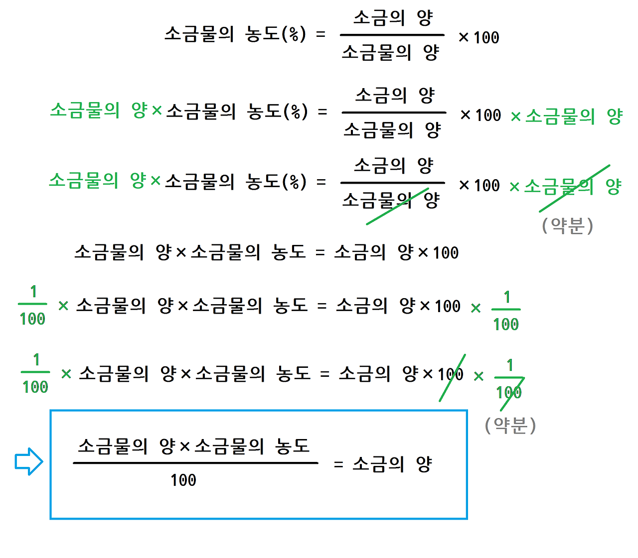 농도 공식이 왜 저렇게 생겼는지 이제 이해할 수 있겠죠? 자 그렇다면 이제 두 번째 공식인 소금의 양 공식에 대해 살펴볼게요.